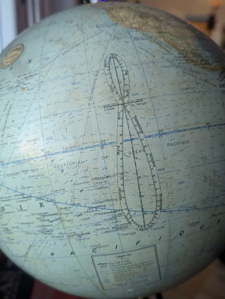 One unique feature of this globe is the analemma. These cartographic devices, best suited to globes, track where the sun is directly overhead at noon for every day of the year, accounting for the Earth spinning on an angled axis and traveling around the sun in an elliptical orbit. The analemma has three hatched scales: the figure-eight calendar track, a detailed latitude scale, and a small horizontal scale.