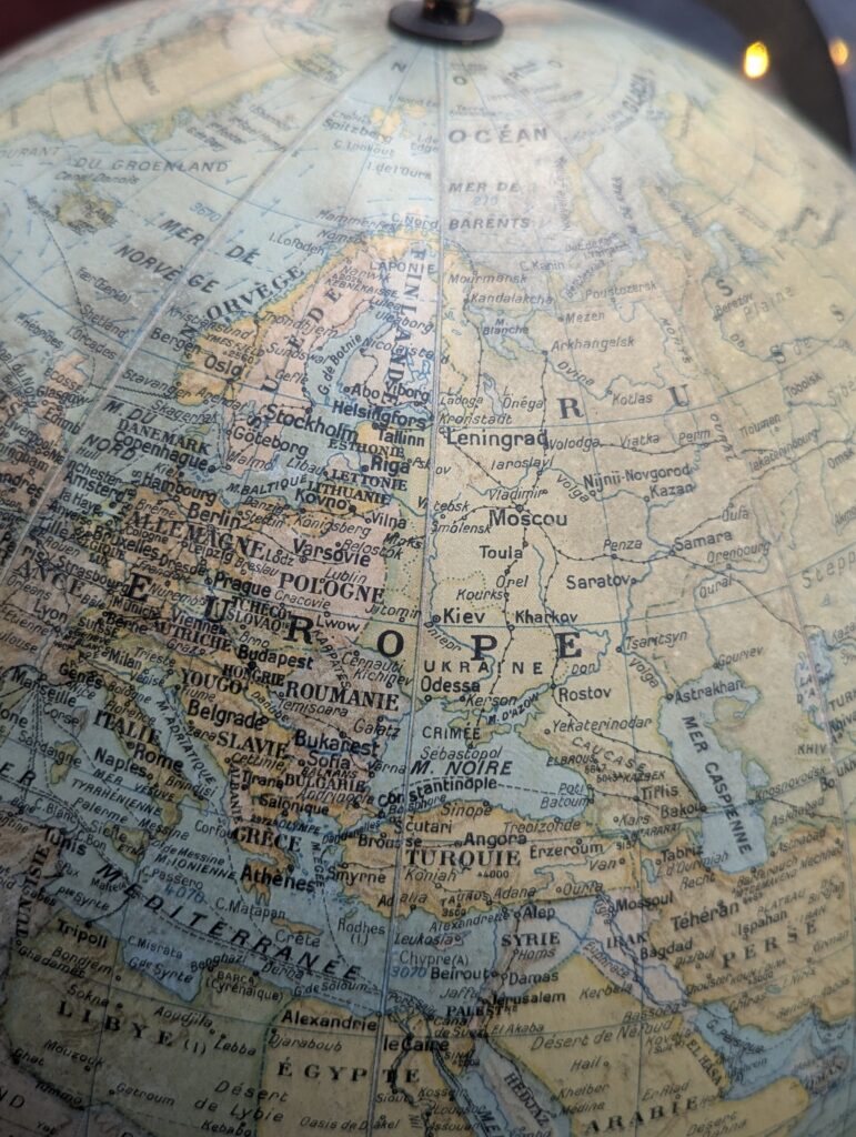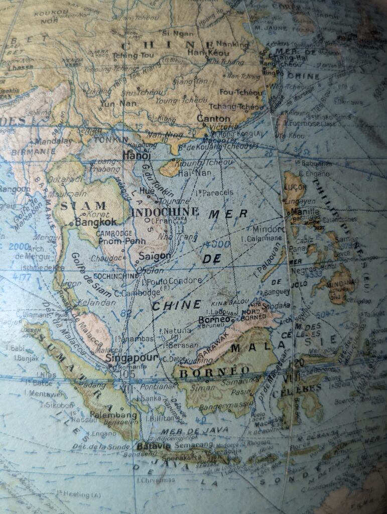 The globe also features France’s colonial empire in its final decades. Most of western Africa, from Gabon and Cameroon, to Chad, Algeria, and Senegal are marked as “Afrique Occidentale Francaise.” In Southeast Asia, Vietnam, Laos, and Cambodia are all shown as the unified French colony of “Indochine.”