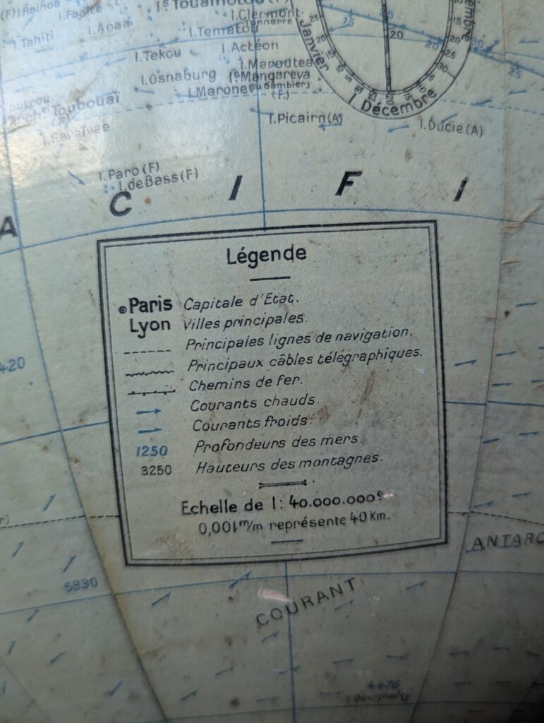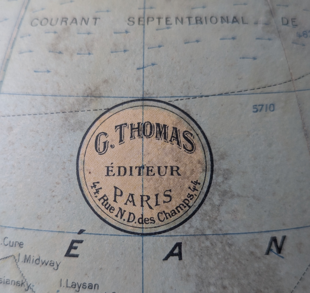 The globe sits on a two-piece turned wooden base, with a brass meridian. The sphere of the globe is roughly 30-35cm, putting it on a scale of 1:40,000,000. The design is an interesting mix of modern and classical, with a cartouche that looks like it comes from the nineteenth century but using sans serif typefaces in many places, such as the legend. In 1925, the globemakers of G. Thomas operated out of 44 Rue Notre Dame des Champs in the 3rd Arrondissement, the Haut Marais. Paris had just hosted the 1925 Exposition Internationale, a key moment in modern art that launched the Art Deco movement.